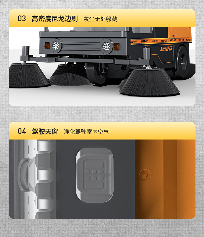榮事達RS-CAR200 駕駛式掃地機配備了雙吸風電機,采用過載欠壓保護裝置,使用更加安全,駕駛式掃地機不僅配備了自主研發的邊刷電機,而且還使用聚氨酯實心胎 和大容量垃圾箱,配件品質高,也提升了使用的性能。 電動掃地車廠家配置了吸塵濾芯,避免了掃地車操作過程中的清掃遺漏問題,能夠實現電動振塵,全封閉的駕駛艙,實現了防雨防塵,滿足戶外道路、公園等場所的使用需求。